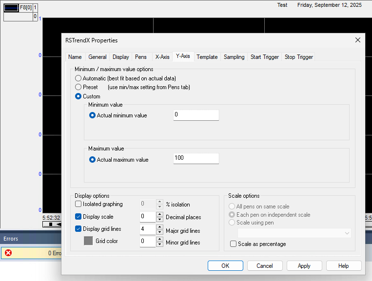 Configure Chart Settings: Right-click the Trend window, select “Chart Properties,” and adjust the X-axis (time span, e.g., 2 minutes) and Y-axis (value range, e.g., 0–100). Disable auto-scaling for clarity.