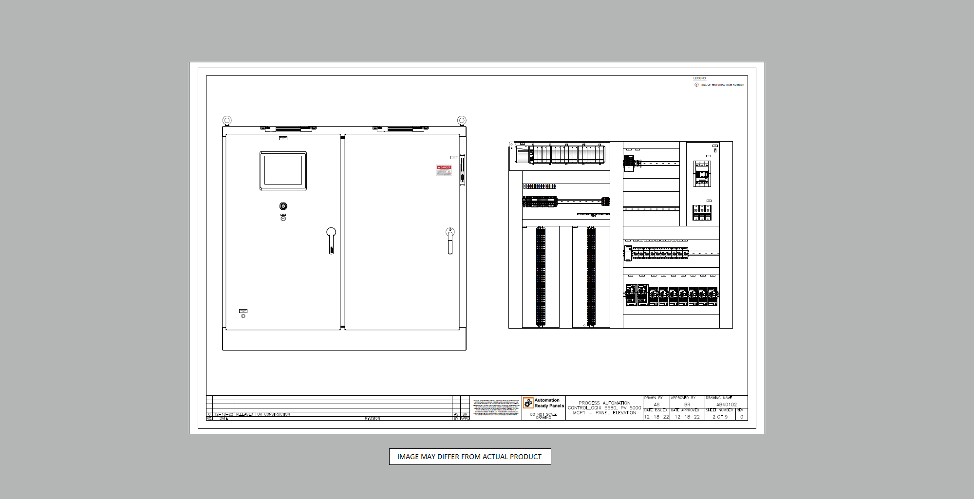 With this control panel, the ControlLogix 5580 PLC can be programmed flexibly with many logic options and HMI with features and settings for operational flexibility. Automation Ready Panels pre-programs this system with Discrete Input Delay (On/Off Timers) programming blocks to keep inputs from flutter or can be used for delay timers on levels, photoeyes, or other sensors. Analog Scaling programming blocks are used for analog inputs/outputs. Motor, VFD, and devices programming blocks are included with feature rich functionality (Rockwell Machine Builder Library V12 and Power Device Library V2.2). Statistical Analysis programming blocks can be used for average and standard deviation calcs for a sample size. VFDs are networked over Ethernet/IP to reduce IO requirements and bring in smart data from the device. Other communications types to Micro800 PLCs, CompactLogix PLCs, Micrologix PLCs, Fanuc Robots, and SMC valve banks are included. A full state machine, shell sequencer programs, and a safety program have been added to reduce final integration time. The HMI has pre-designed graphics for OEE production data (current and previous shift), Cycle Timer, Production Rate, Recipe Status, State Machine and Sequencer Status, Alarming and Alarm Management, VFD control status and faults popup, Valve and device control and status popups, settings input boxes, motor valve analog discrete device objects with breadcrumbs, historical trending, user security, recipe management, PDF Viewer with manuals and electrical drawings embedded in the HMI, Process Reports, Preventive Maintenance Report, Emailing Reports, and Batch Tracking. If desired, one of Automation Ready Panels controls engineers can program up to one hour of free programming (**) to finish off your sequencer, meeting your applications needs. This means that a fully functional controls system can be delivered and ready to install, wire sensors and motors, power up, and the system is up and running.